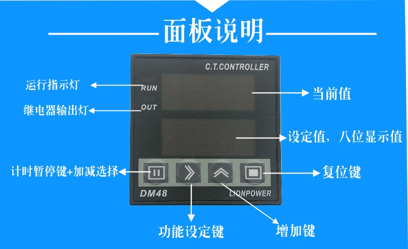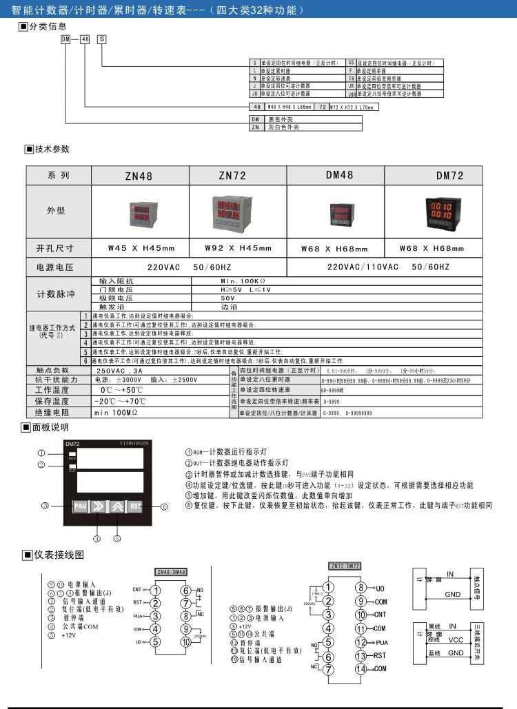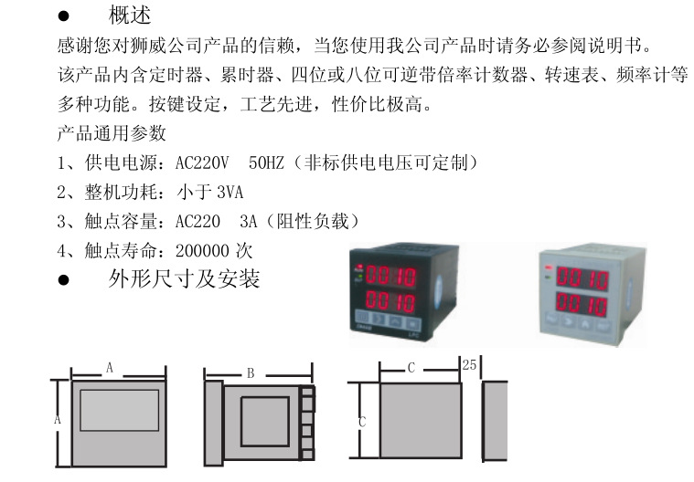 本產(chǎn)品采用進(jìn)口單片機(jī)編程,采樣精準(zhǔn),抗干擾強(qiáng),集合了多項功能于一體,可用作計數(shù)、計米、計時、累時、轉(zhuǎn)速、頻率等,細(xì)分功能達(dá)32種,5繼電器動作方式可選,開孔尺寸45*45mm,常規(guī)出貨220V,電源可以定制改為DC24V,適用范圍廣,操作簡單。